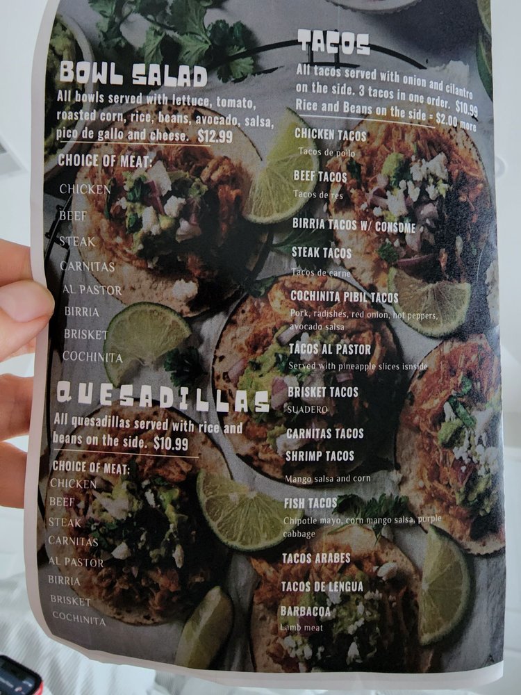 Choice of meat: chicken, steak, birria, beef, cochinita, al pastor, brisket, carnitas.